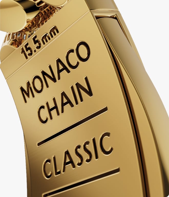 Monaco Chain se presenta junto a elegantes grabados: el quilataje, las dimensiones y el nombre de la colección, ubicados en la parte posterior del broche.