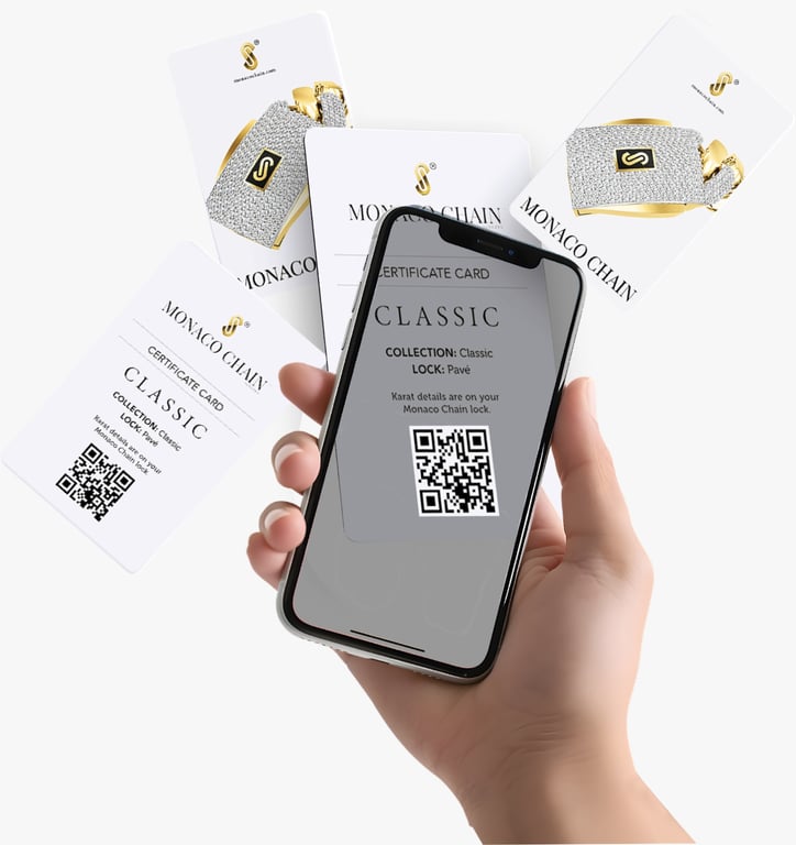 Cada producto de Monaco Chain incluye una tarjeta de certificado que garantiza su autenticidad y calidad. Este certificado verifica la originalidad del producto, brindándote tranquilidad en tu compra.